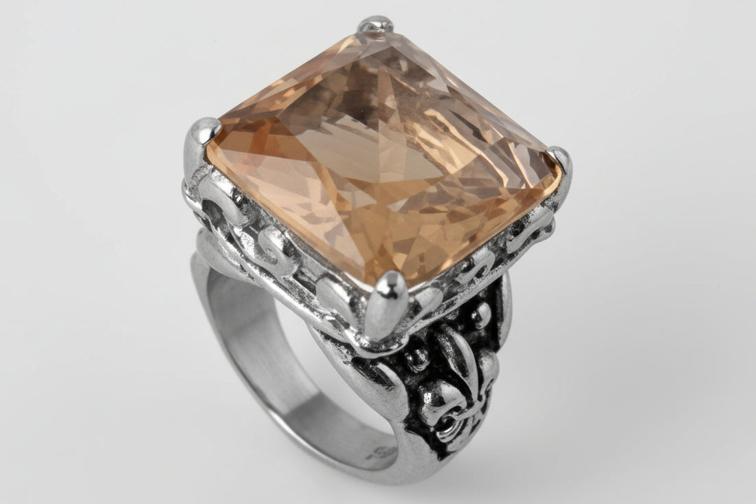 Stainless Steel Casting Ring Fleur De Lis Champagne CZ Cocktail Ring Product Code: MSR-498 Face Width: 21mm Band Width: 4mm Finish: High Polished; Oxidized Stone: Light Champagne CZ