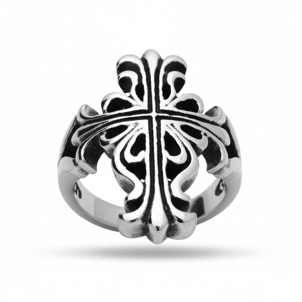 Stainless Steel Casting Ring Oxidized Floral Cross