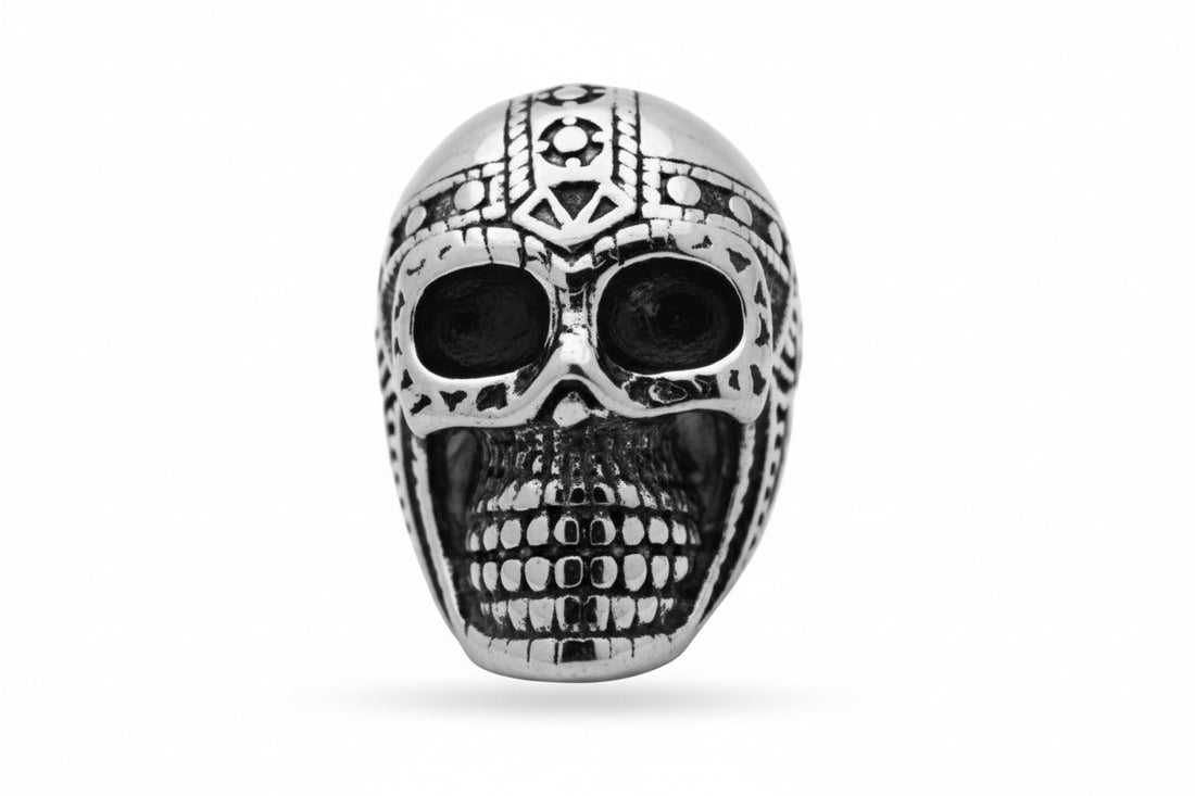 Stainless Steel Casting Ring Oxidized Skull with tribal Head dress Product Code: MSR-1068 Face Width: 36mm Band Width: 6mm Finish: High Polish; Oxidized Stone: No Stone