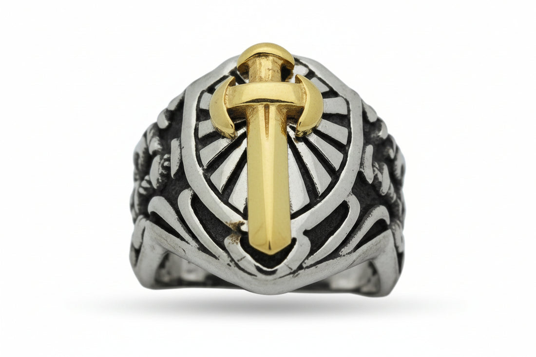 Stainless Steel Casting Ring Oxidized Two Tone Sword and Shield Product Code: MSR-1070 Face Width: 23mm Band Width: 5mm Finish: High Polish; Oxidized Stone: No Stone